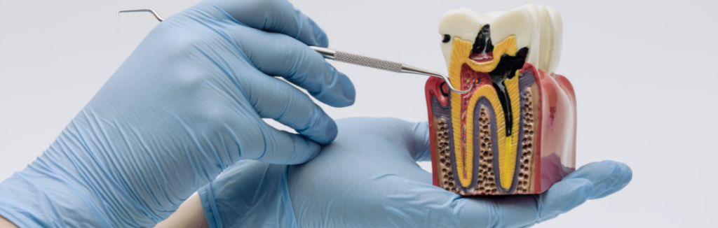 When decay reaches the pulp — the inner core of the tooth where the nerve lives — the situation becomes more serious. Pain may become throbbing, intense, and sometimes strong enough to wake someone at night. Once bacteria infect the pulp, the damage is no longer reversible. Treatment typically requires a root canal to remove the infected nerve tissue, followed by restorative care to protect and strengthen the tooth.